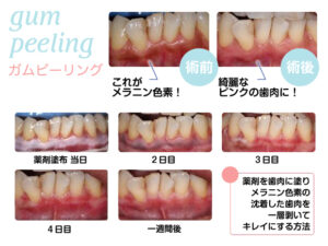 ガムピーリングとは、専用の薬剤やレーザーを使って、歯茎の表面にあるメラニン色素が沈着した古い層を一枚取り除く治療法です。